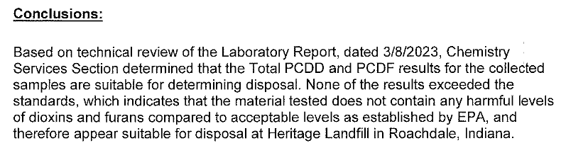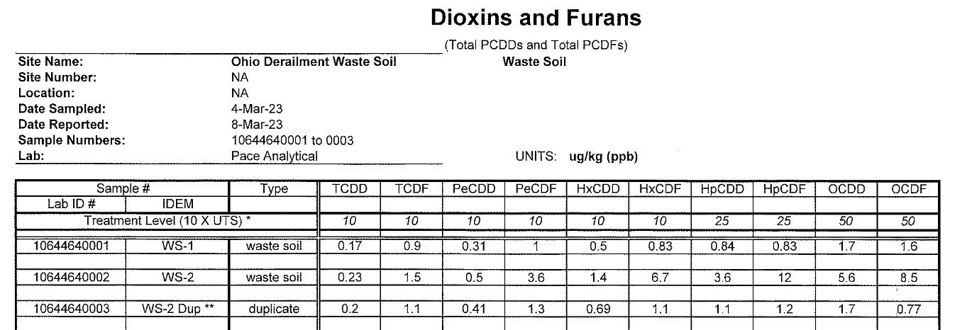 Indiana recently published their results for dioxin and furan levels in waste soil they received from the site of the Ohio train crash: